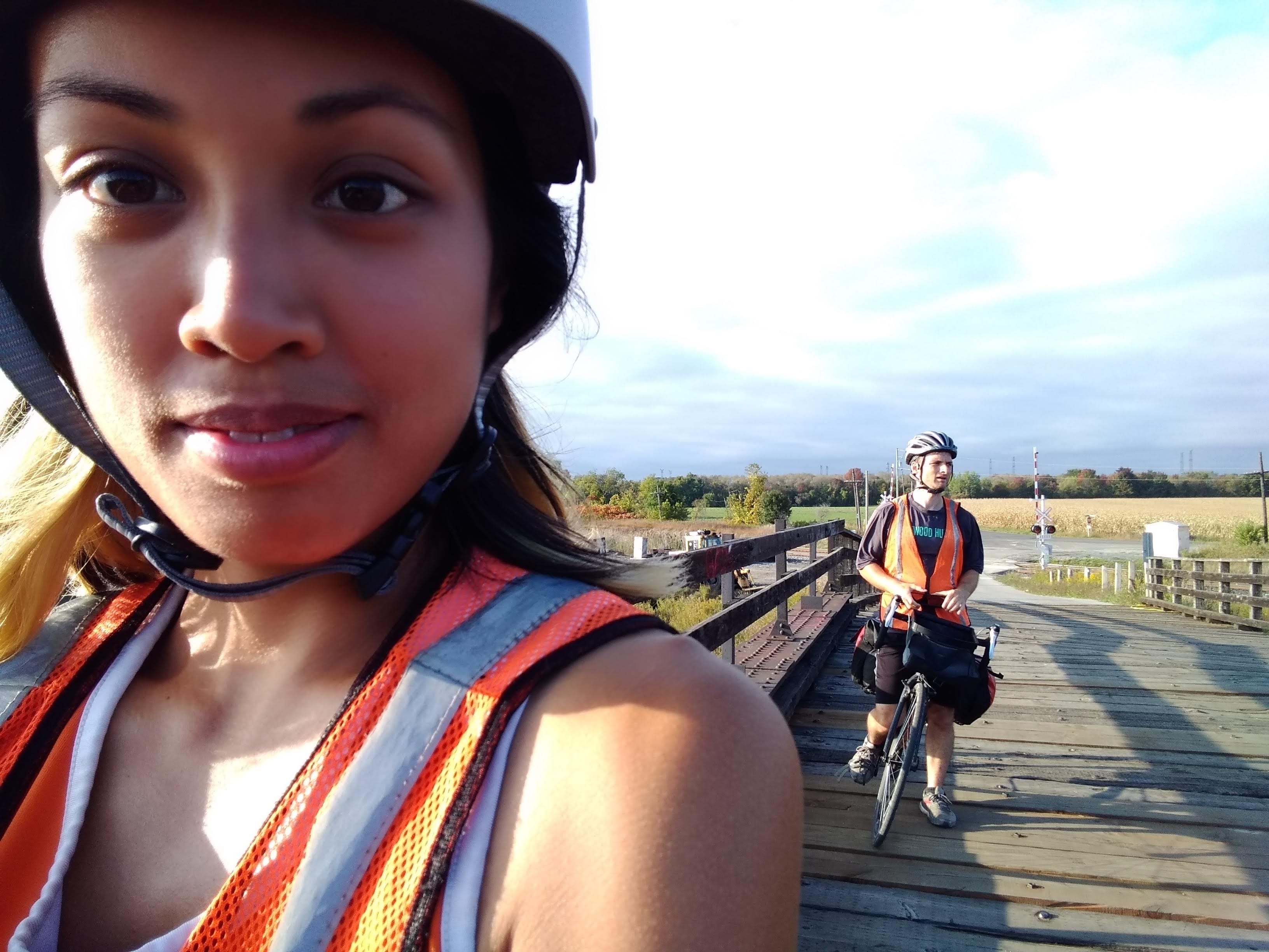 We took a few busy roads to Waterfront Trail. As we passed through a town on route, we tried to set up at the Port Hope Public Library and were surprised to discover that they serviced residents only. So much for public. We staged ourselves at Dreamers Cafe just down the street where we enjoyed some French music, coffee, lobster rolls, ice cream, and their famous Crazy Cookie (a chocolate chip cookie loaded with caramel, nuts, and more chocolate) at a sidewalk table. Camille chatted with a group of senior Dreamers dressed in biking attire. They were from Bowmanville (our destination for the night) and were on one of their many weekly bike rides. The joyful group had been biking together for a long time and were still kicking butt well into their seventies.