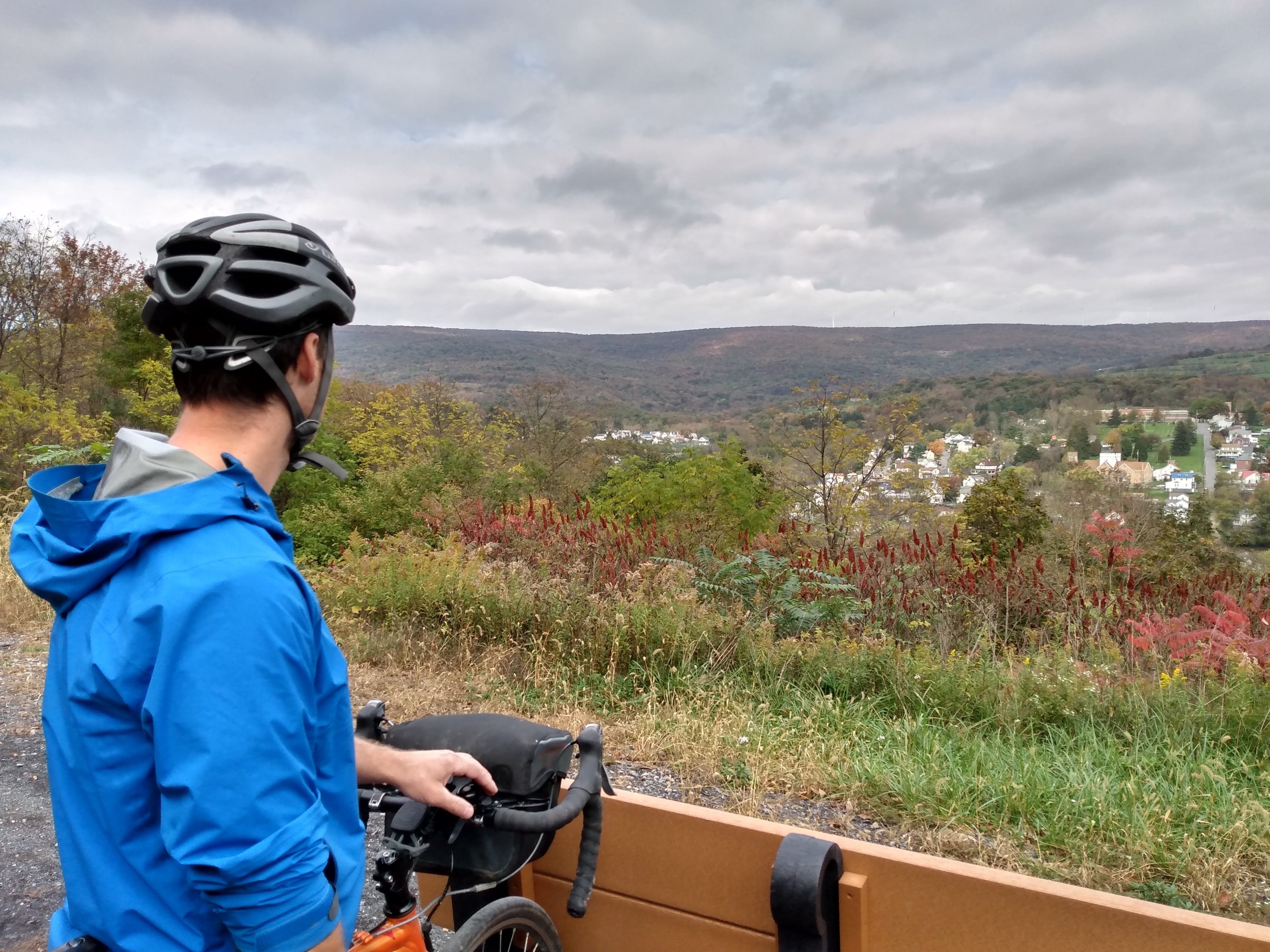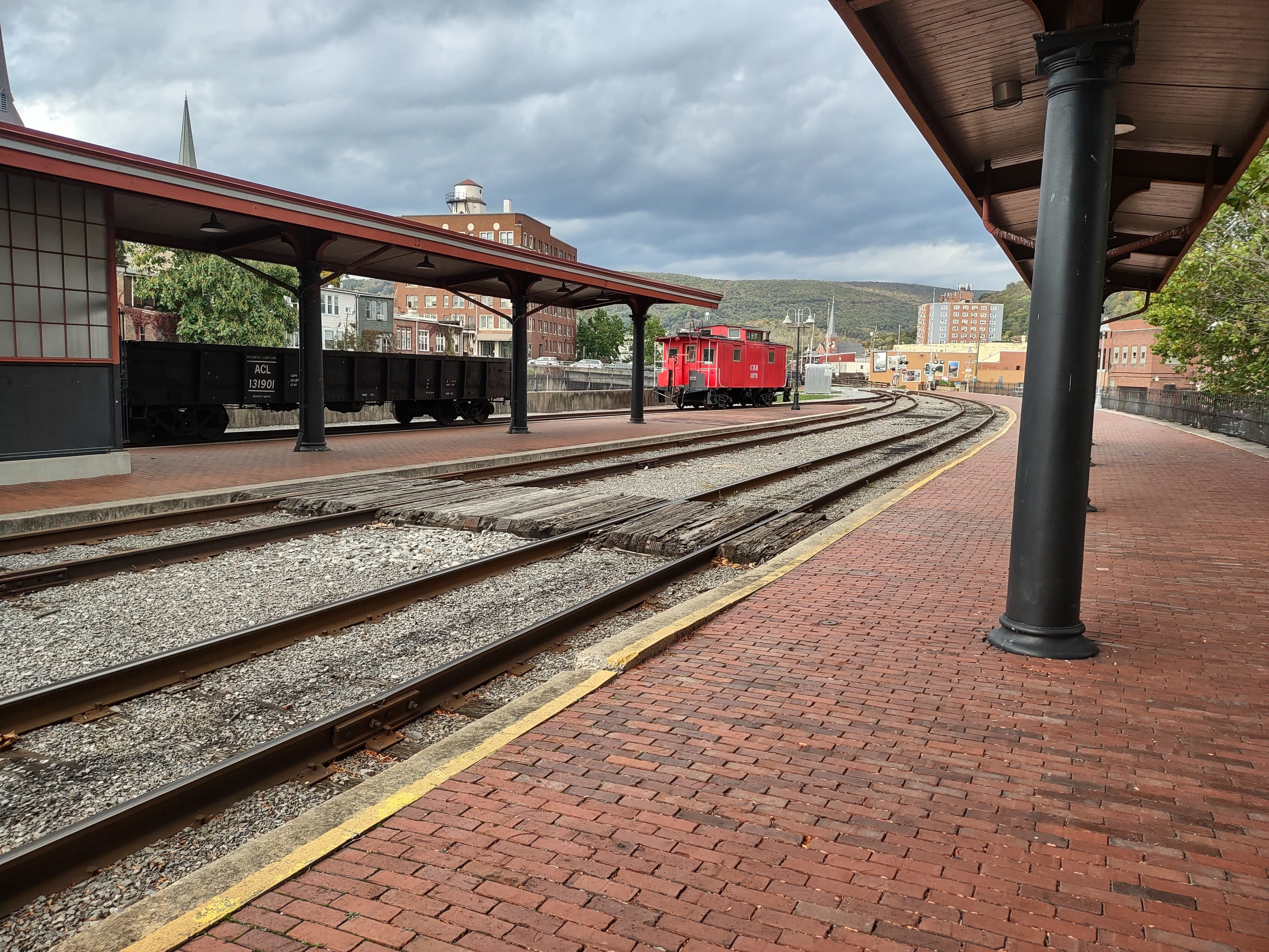 The tree-lined path out of Frostburg offered great views for the last few miles of GAP into Cumberland. We flew down the mountain with the sun's rays to warm us despite the windchill. With just 2 miles to go to Cumberland, we managed a flat tire. There were a few passenger trains going by that kept things interesting while we made the fix. We finally rolled into town and immediately found a laundromat. Greg enjoyed playing the one arcade game hosted there: Mrs. Pacman.