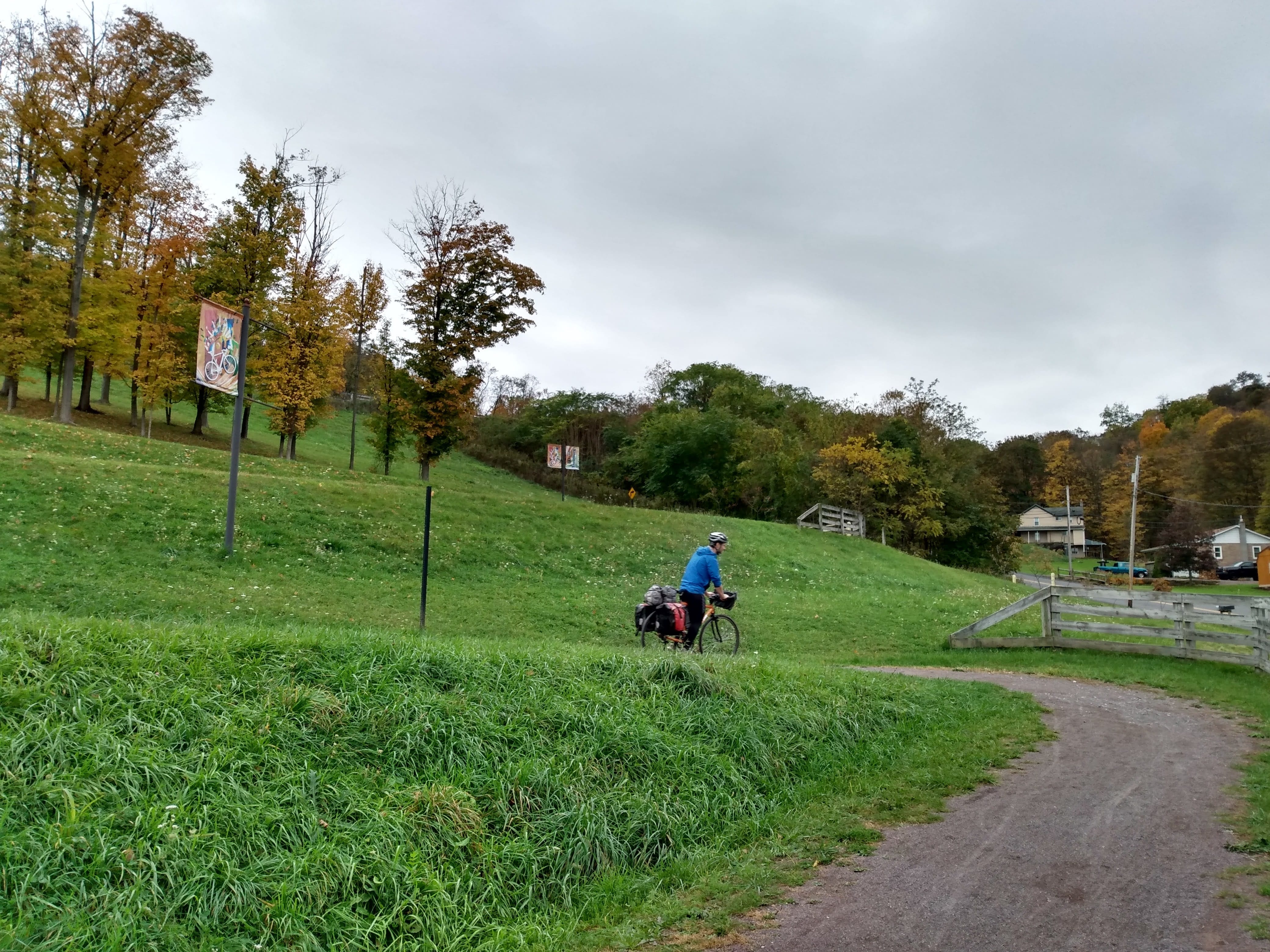 The town had many supports built in for trail users; bike shops and outdoor sports stores were plenty as well as water fountains and bike fixing stations. We started the C & O trail in our usual style with another flat. We happened to pull over in front of a house by the trail so as to not impede the path, and the homeowner came over after noticing us. Rex offered help in the form of an electric pump, a kind gesture that would've saved us from our manual labor, but unfortunately, Greg's tire didn't hold its patch. We ended up changing the tube and went on until it failed again a few miles later.