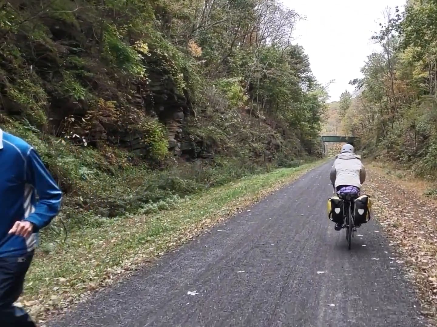 We followed the riverside trail until we reached the detour at Paw Paw Tunnel we had read about the night before. Imagine you're pushing a heavy shopping cart up a hill. Make that hill steeper. Make it just a little more steep, but now, your shopping cart has to stay beside you while you're pushing. Someone actually stole two of your wheels, so you've got to make sure you balance it right. Oh, and turn the lights off and scatter piles of leaves in your path.