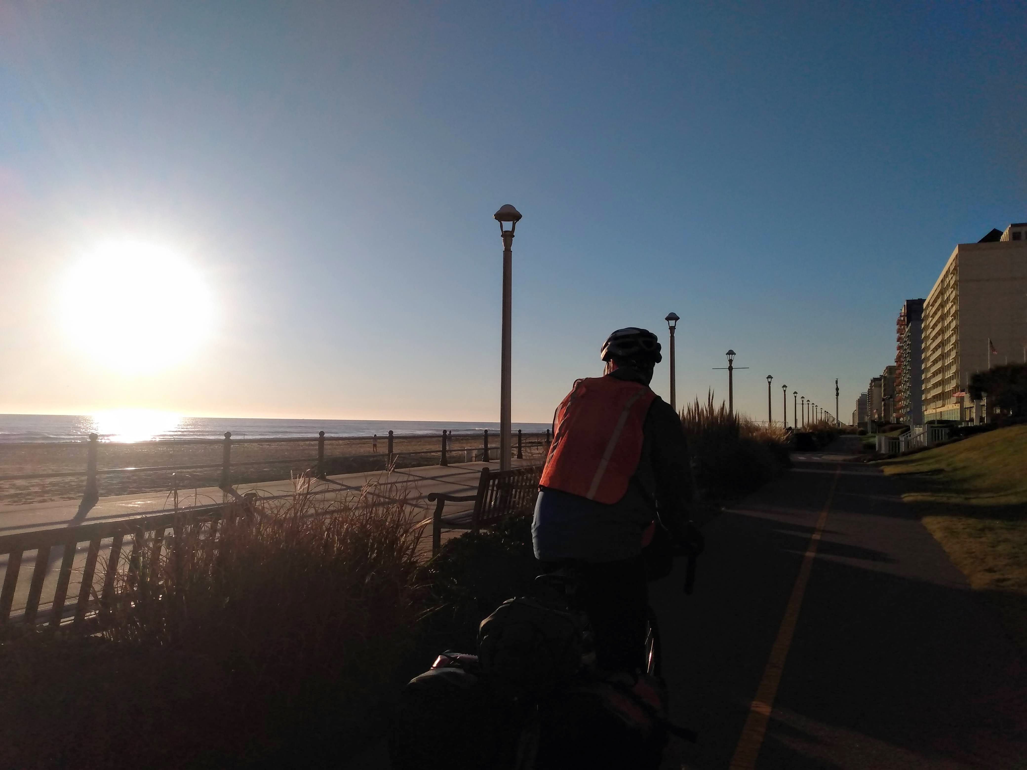 We woke up to a cold, dark, quiet morning and started to break down camp. Our hope was that we'd be finished quickly enough to catch the sun rise on the beach, but between drying dew off the tent, shaking off morning grogginess and biking the 4+ miles to an eastward facing beach, that definitely didn't happen. We arrived at the Virginia Beach boardwalk at least half an hour after sunrise but it was still nice to see the sun low on the horizon. There was some exercise equipment setup on the beach (monkey bars, a climbing rope, rings) and we spent some time trying them out.