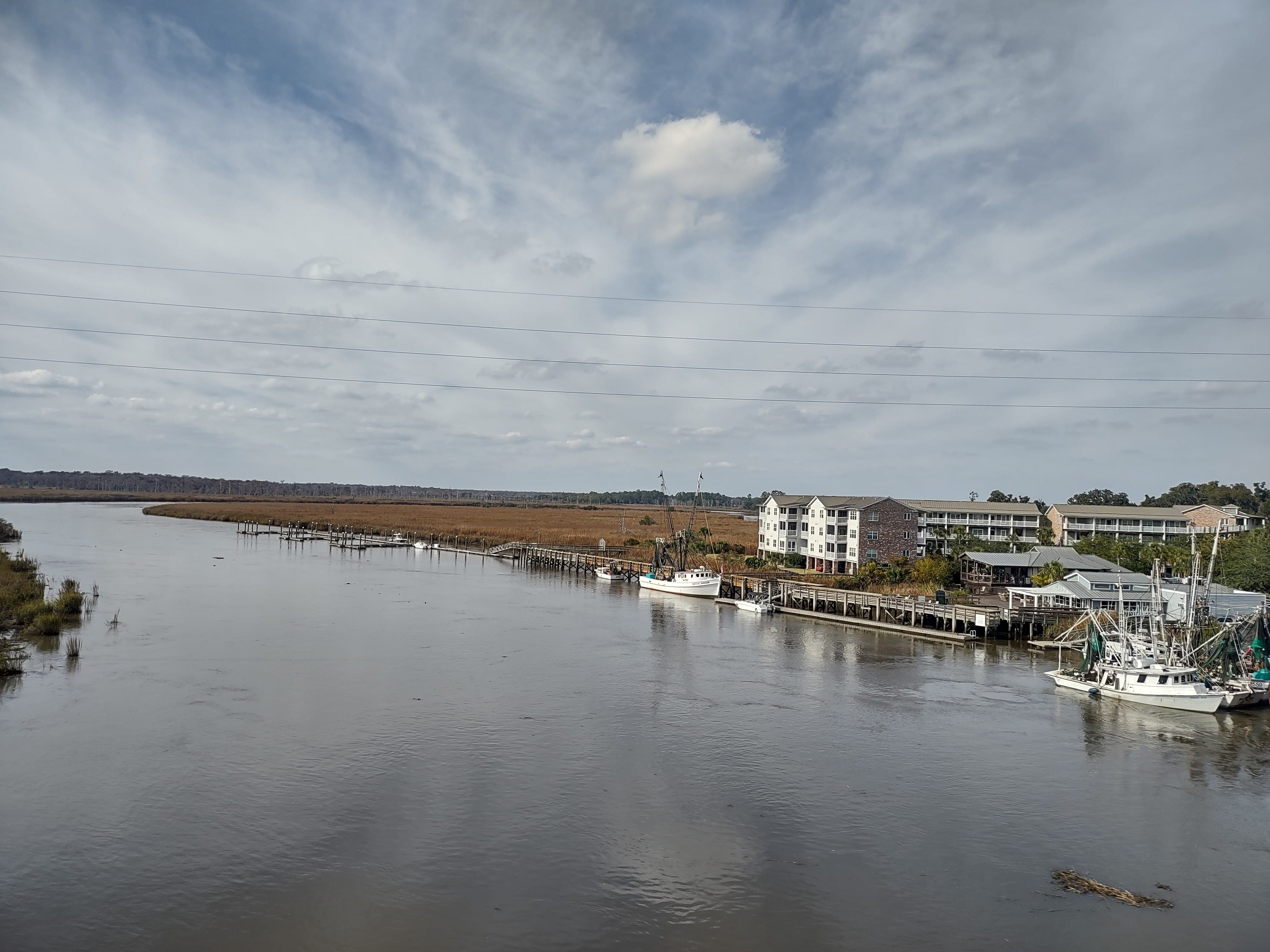 Continuing into Darien, there were houses to our left lining a hill with clear views to the marshlands and river beyond. Combined with the huge trees hanging over the road covered in spanish moss, this area really felt like it had a very unique character. Eventually we turned left onto a bridge crossing the river and stopped to enjoy the scenery. This was the first of many bridges we'd cross in the afternoon.