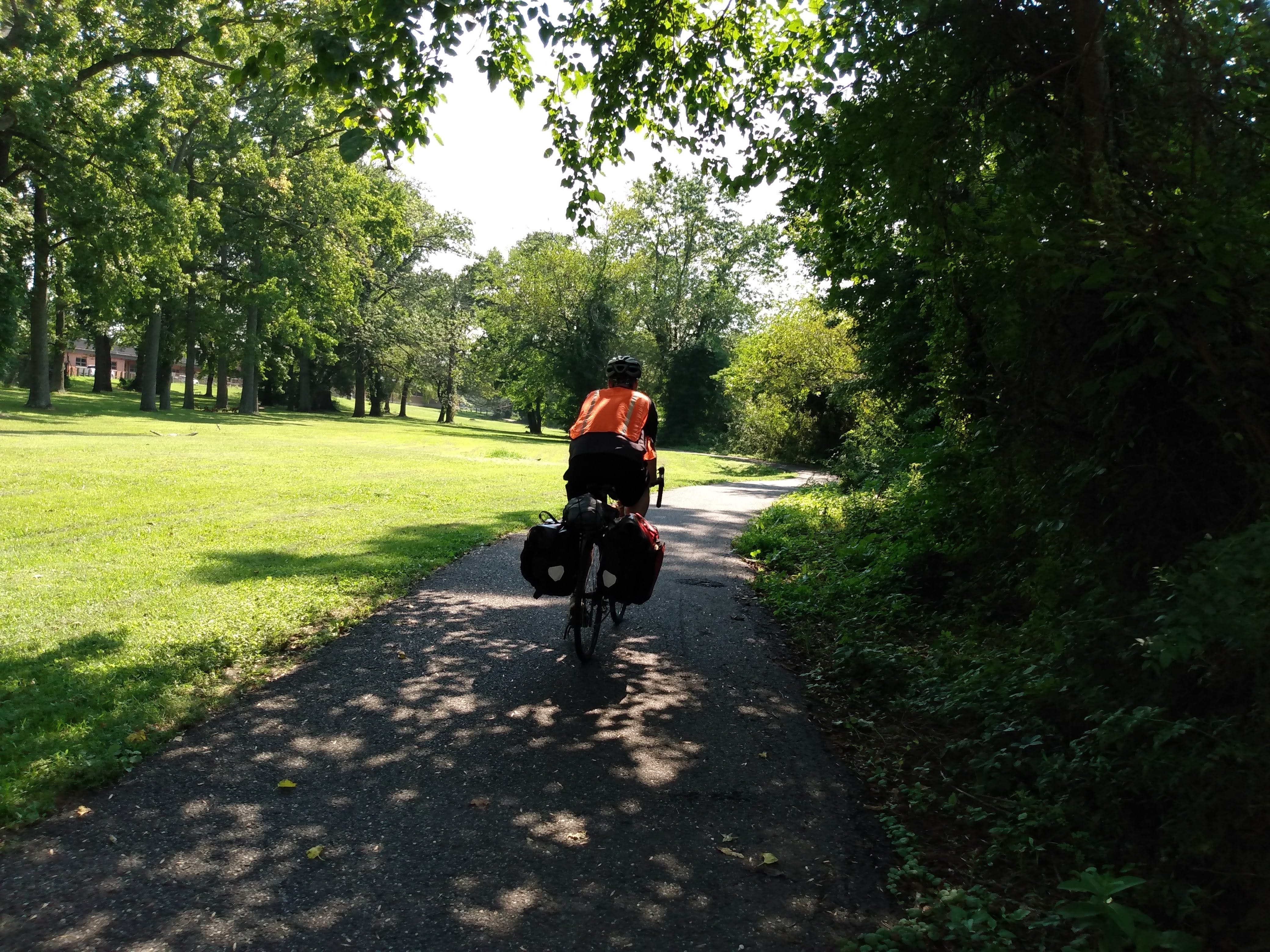 The town had many supports built in for trail users; bike shops and outdoor sports stores were plenty as well as water fountains and bike fixing stations. We started the C & O trail in our usual style with another flat. We happened to pull over in front of a house by the trail so as to not impede the path, and the homeowner came over after noticing us. Rex offered help in the form of an electric pump, a kind gesture that would've saved us from our manual labor, but unfortunately, Greg's tire didn't hold its patch. We ended up changing the tube and went on until it failed again a few miles later.