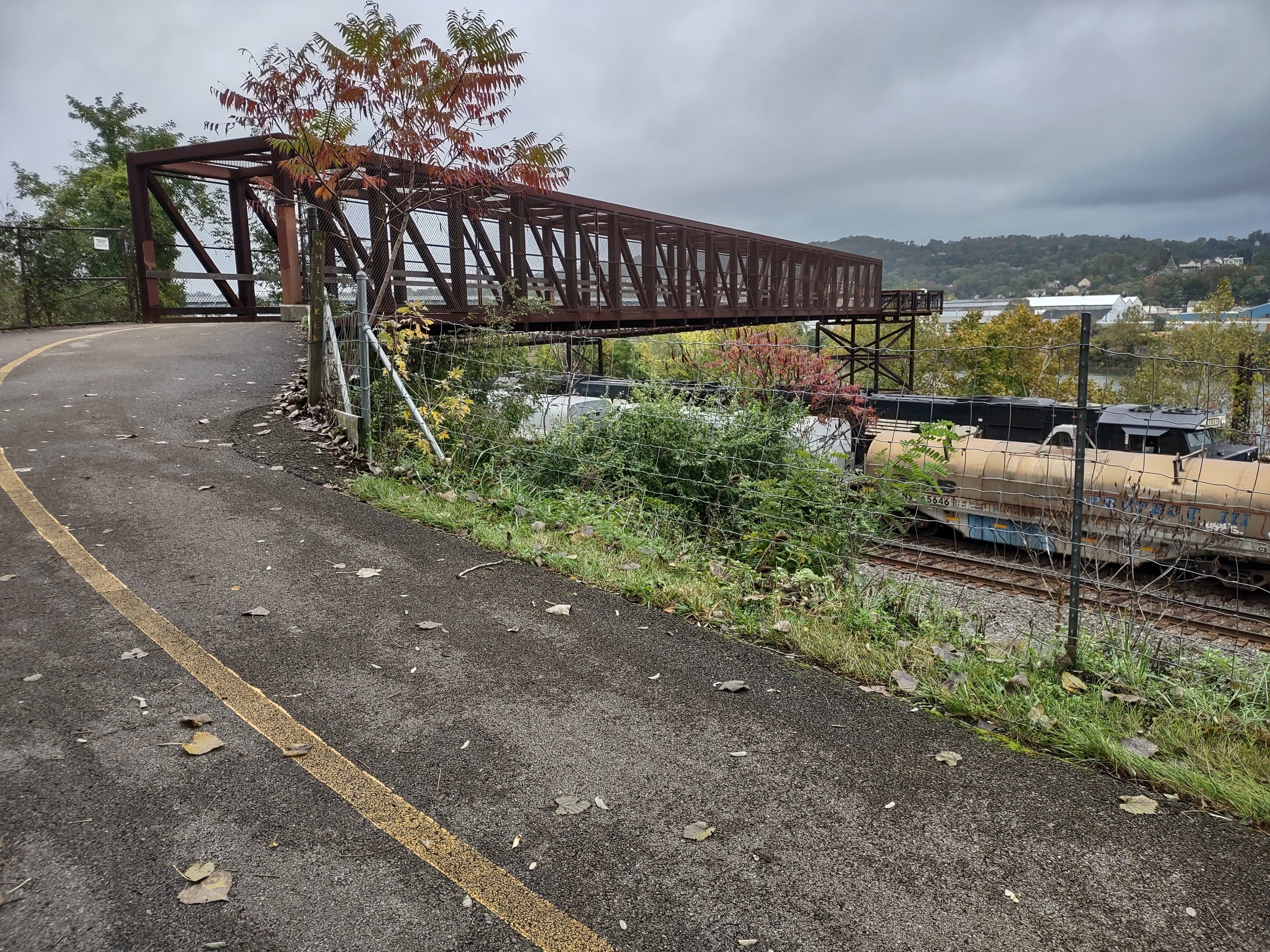 The tree-lined path out of Frostburg offered great views for the last few miles of GAP into Cumberland. We flew down the mountain with the sun's rays to warm us despite the windchill. With just 2 miles to go to Cumberland, we managed a flat tire. There were a few passenger trains going by that kept things interesting while we made the fix. We finally rolled into town and immediately found a laundromat. Greg enjoyed playing the one arcade game hosted there: Mrs. Pacman.